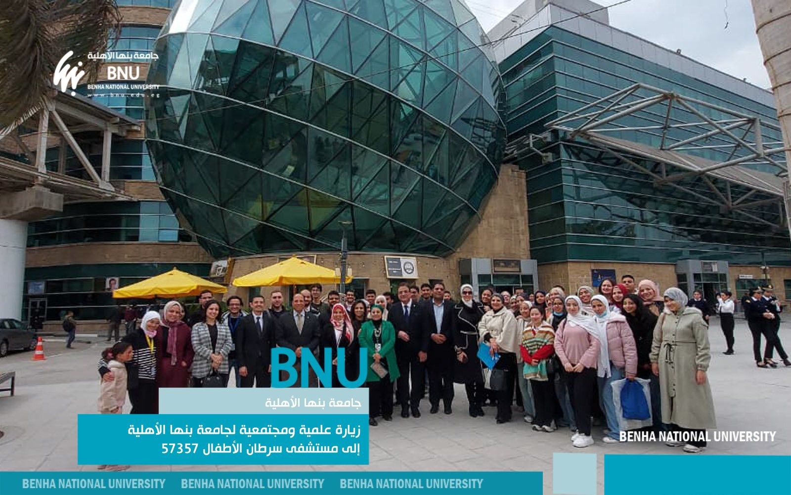 تحت رعاية الدكتور تامر سمير، رئيس جامعة بنها الأهلية، وتحت إشراف الدكتور محمود شكل، نائب رئيس الجامعة لشؤون التوظيف والابتكار وريادة الأعمال، نظمت الجامعة زيارة علمية ومجتمعية إلى مستشفى سرطان الأطفال 57357، بمشاركة وفد من أعضاء هيئة التدريس والهيئة المعاونة وطلاب الكليات المختلفة، وذلك في إطار تعزيز الشراكات مع المؤسسات الطبية الرائدة ودعم الدور المجتمعي للجامعة.