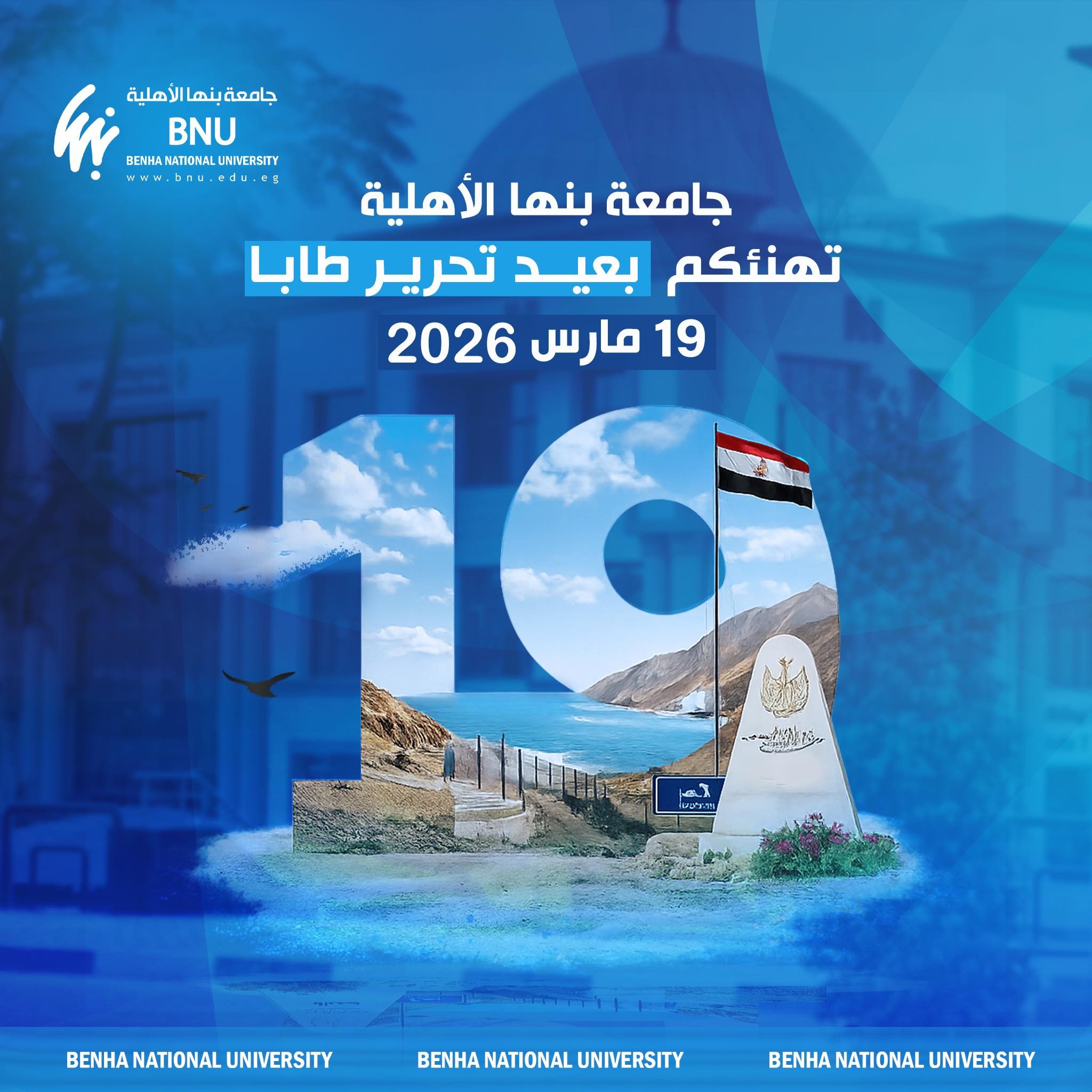 تتقدم جامعة بنها الأهلية بخالص التهنئة إلى الشعب المصري العظيم، بمناسبة ذكرى تحرير طابا، تلك المناسبة الوطنية الخالدة التي تجسد إرادة شعب لا يعرف المستحيل.